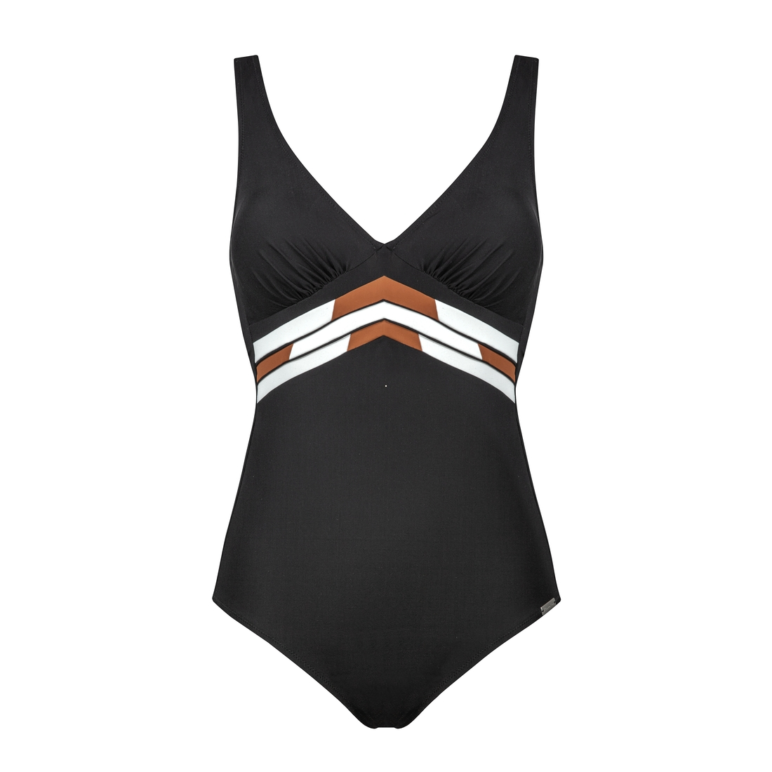 Distingué et discret, ce maillot noir sublimera une large gamme de morphologie. Sa bande marron et blanche souligne et met en valeur la taille.