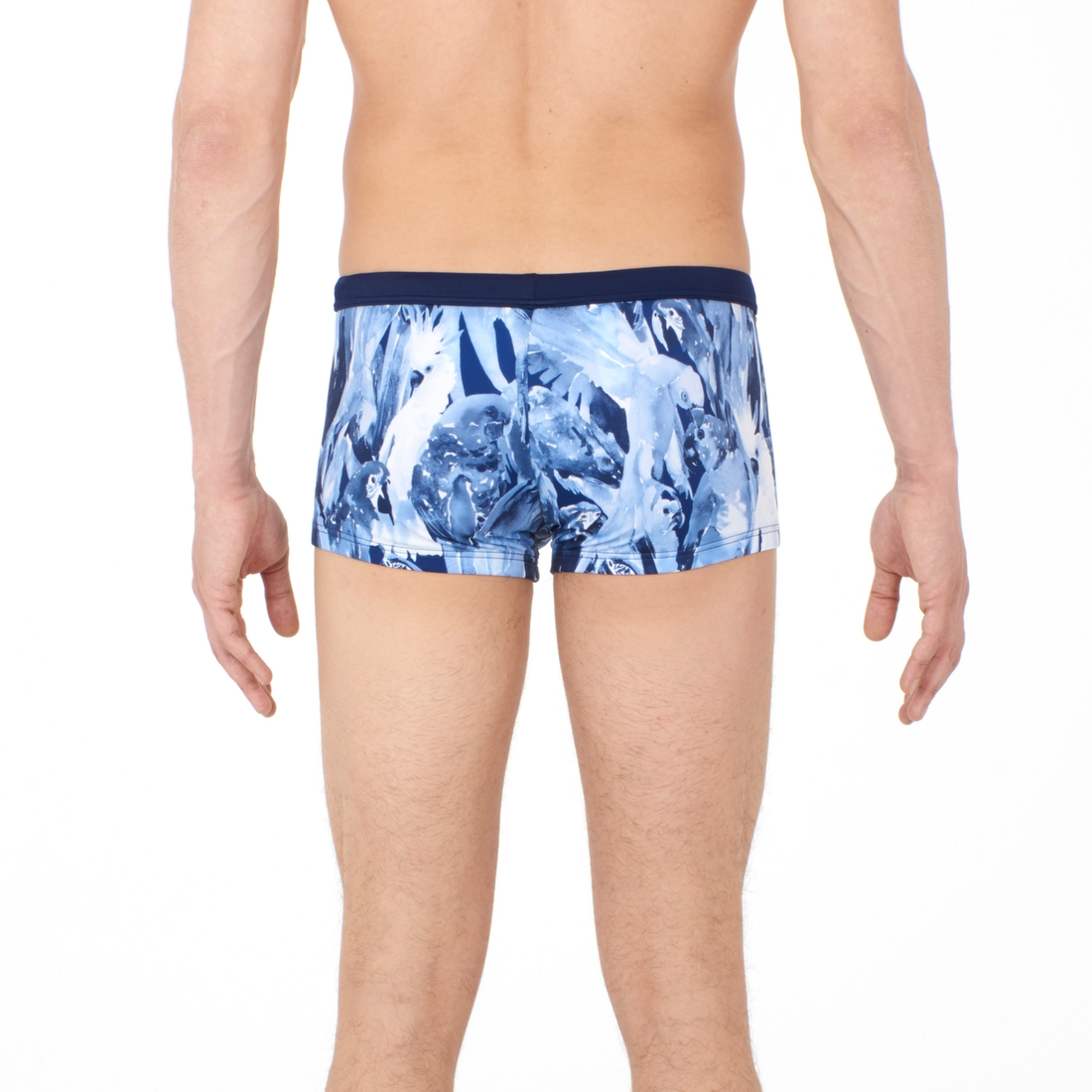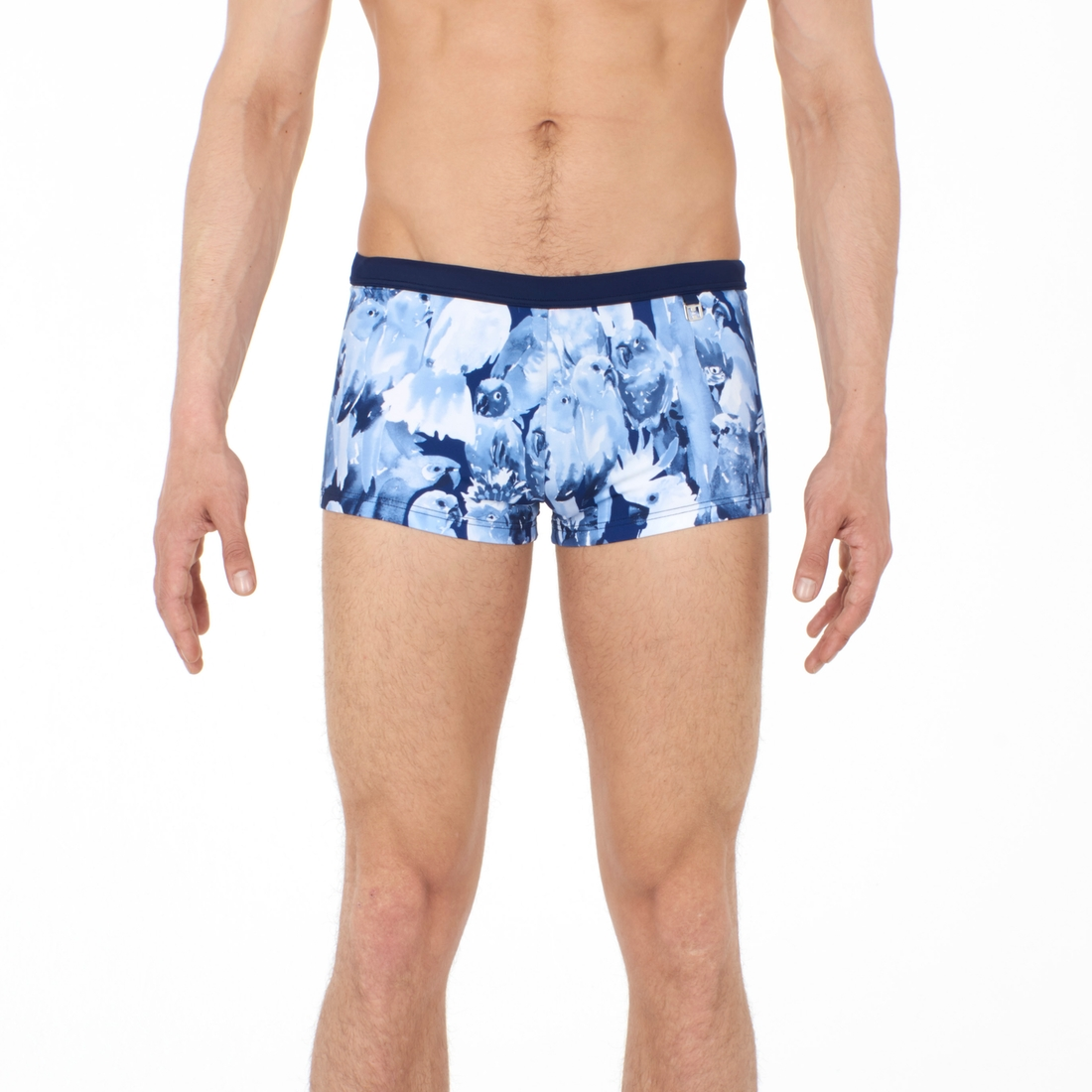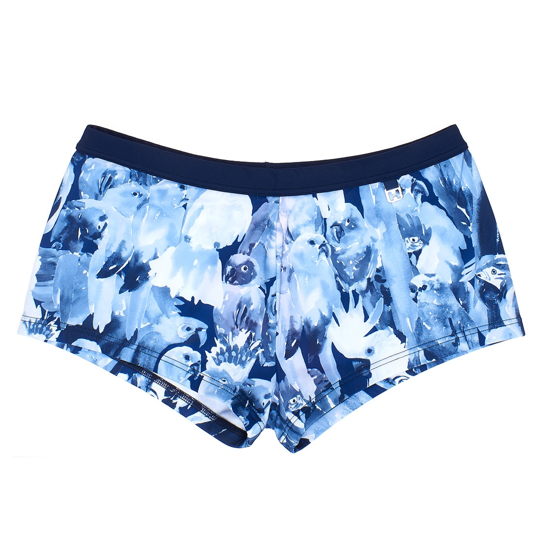 Shorty de bain PAPAGAYO coloré et fun de la saison. Grâce à son imprimé multicolore de perroquets sur fond bleu effet peinture acrylique et aquarelle, ce shorty de bain pour homme réveille votre côté arty dans une ambiance tropicale acidulée pour un look fashion pointu.