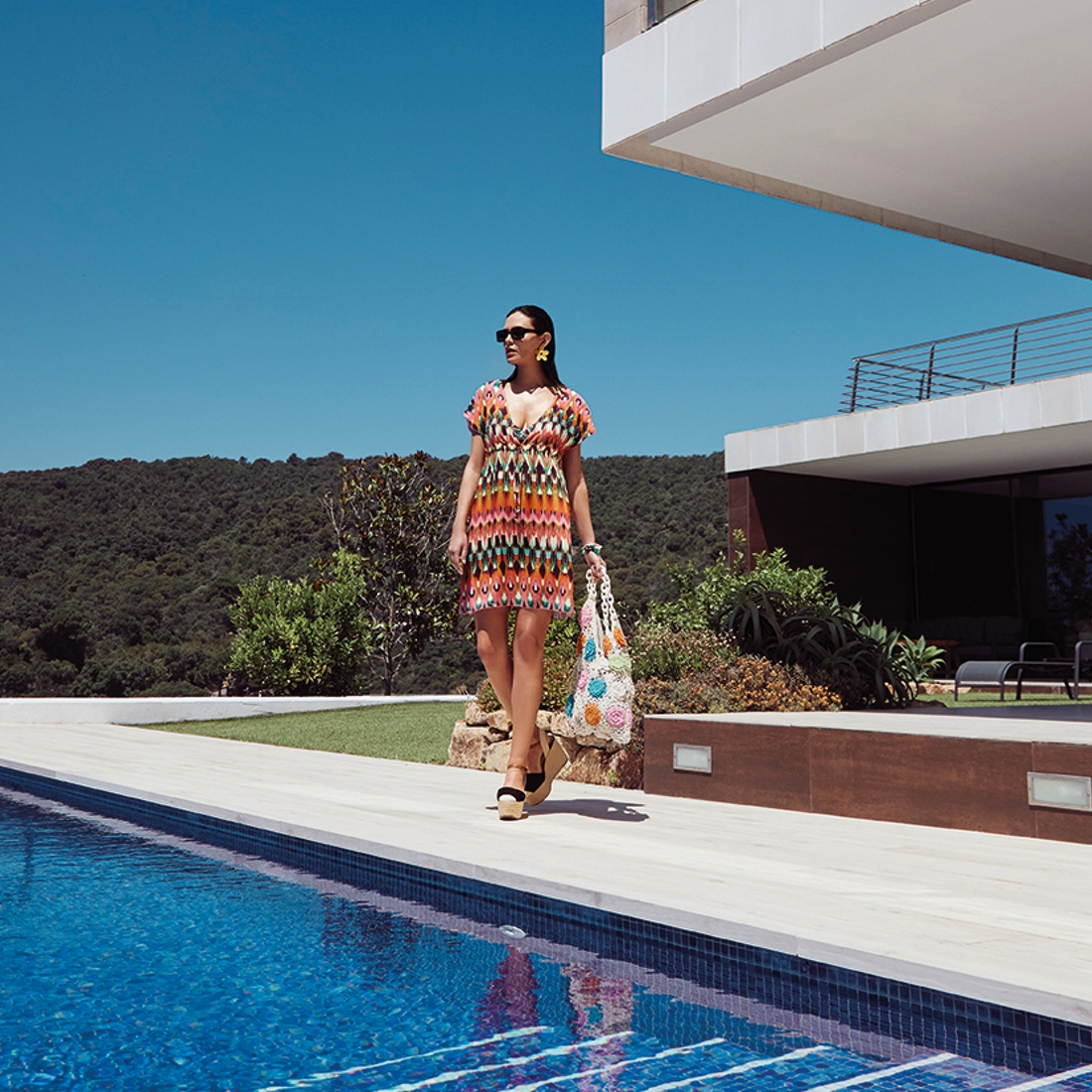 Ce joli imprimé coloré rose et vert séduira une large gamme de morphologie. Les couleurs sont chics et tendances.