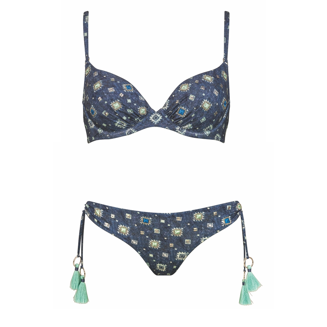 Maillot deux pièces effet jean Watercult. La quincaillerie métallique et les pompons fixés aux anneaux en métal argenté donnent au look une touche pointue.